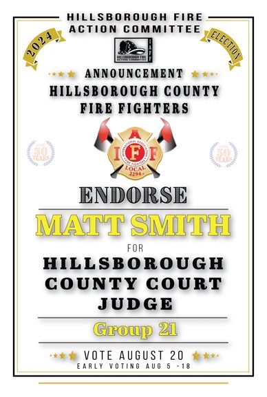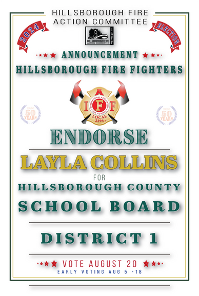 Hillsborough Fire Fighters endorsements are grounded in a candidate's position on issues relating to our profession as firefighters and the public's safety. We proactively support the position that electors have the right to vote for the candidate who represents their own views and political philosophy. However, if there is a tipping point where guidance is being sought for a candidate consider the one with our endorsement.